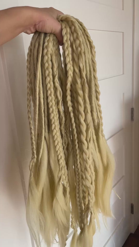 This Pre-Made set ships in just THREE days! Take the wait and guessing out of the equation with THE BONDI. THE BONDI is a full set that includes 9 packs in total. In those 9 packs you will receive 5 packs of our light blonde standards, 2 packs of our light blonde braid twists, and 2 packs of our light blonde celtics. Each pre-made set is one of a kind.